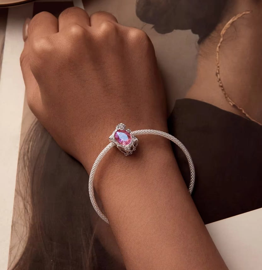 - Transparentny ryształ zdobiący charms odbija światło, tworząc efekt delikatnej gry kolorów.