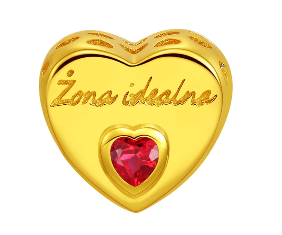 Oryginalne charmsy z napisami i symbolicznymi motywami cieszą się ogromną popularnością, ponieważ pozwalają tworzyć kolekcję biżuterii pełną osobistego znaczenia. Charms Żona Idealna doskonale wpisuje się w ten trend, łącząc klasyczną formę serca z wyjątkowym grawerem i subtelnym czerwonym akcentem. To model, który może być pięknym symbolem miłości małżeńskiej, wdzięczności, oddania i codziennej bliskości. Napis „Żona idealna” sprawia, że ten charms staje się wyjątkowym upominkiem od serca – pełnym ciepła, emocji i elegancji. Czerwone cyrkoniowe serduszko dodaje zawieszce wyrazistości i podkreśla romantyczny charakter biżuterii, a pozłacane wykończenie nadaje całości szlachetnego wyglądu.