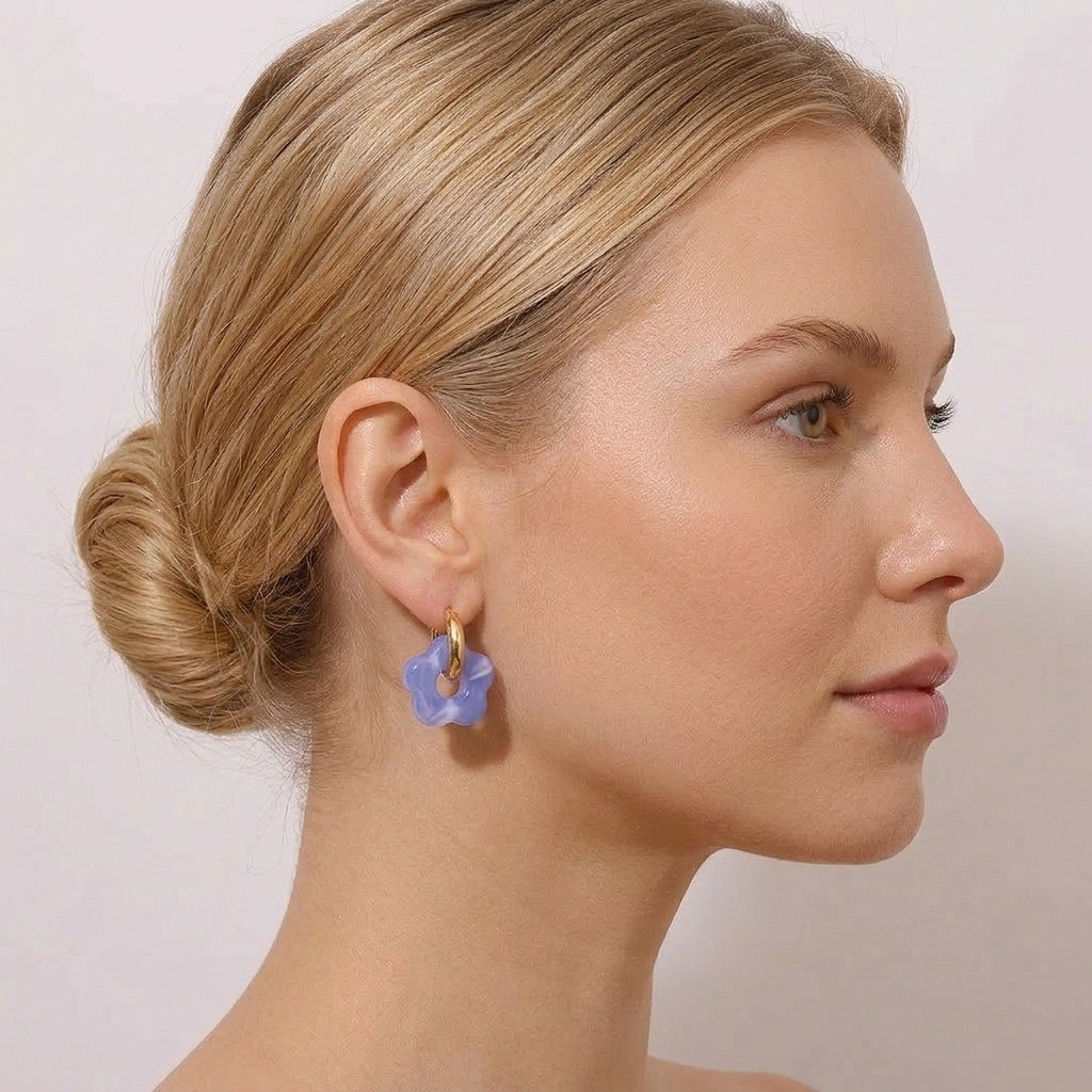 Wyjątkowe kolczyki Błękitny Kwiatek to propozycja dla kobiet, które kochają subtelną biżuterię inspirowaną naturą i lekkim, dziewczęcym stylem. Wykonane ze stali szlachetnej pokrytej 18-karatowym złotem zachwycają eleganckim połyskiem oraz wysoką trwałością. Ich forma opiera się na szerszych złotych kółkach, które zostały ozdobione dużym, zawieszonym błękitnym kwiatkiem wykonanym z lekkiego akrylu. To kolczyki pozłacane, które łączą klasyczną elegancję z modnym, świeżym akcentem kolorystycznym.