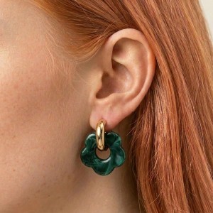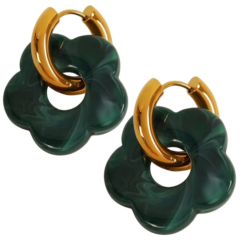 Połączenie złotych kółek z akrylowym kwiatkiem tworzy harmonijną i estetyczną całość. Kolczyki pozłacane Ciemnozielony Kwiatek to idealne połączenie jakości wykonania, wygody oraz modnego designu inspirowanego naturą.
