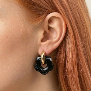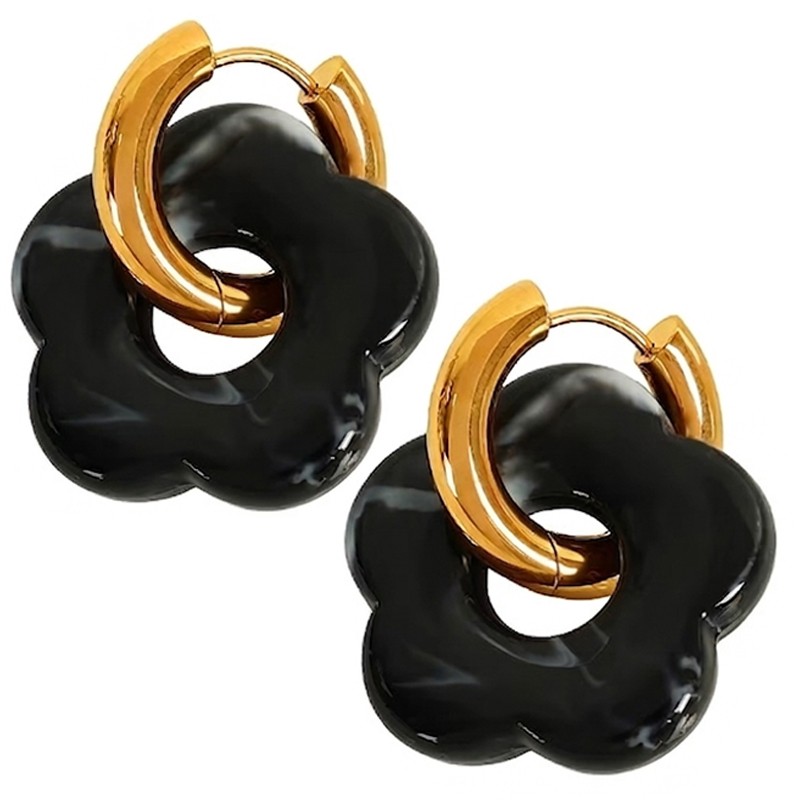 Złote kółka w połączeniu z akrylowym kwiatkiem tworzą harmonijną, dopracowaną całość. Kolczyki pozłacane Czarny Kwiatek to idealne połączenie jakości wykonania, wygody oraz modnego wzornictwa inspirowanego naturą.