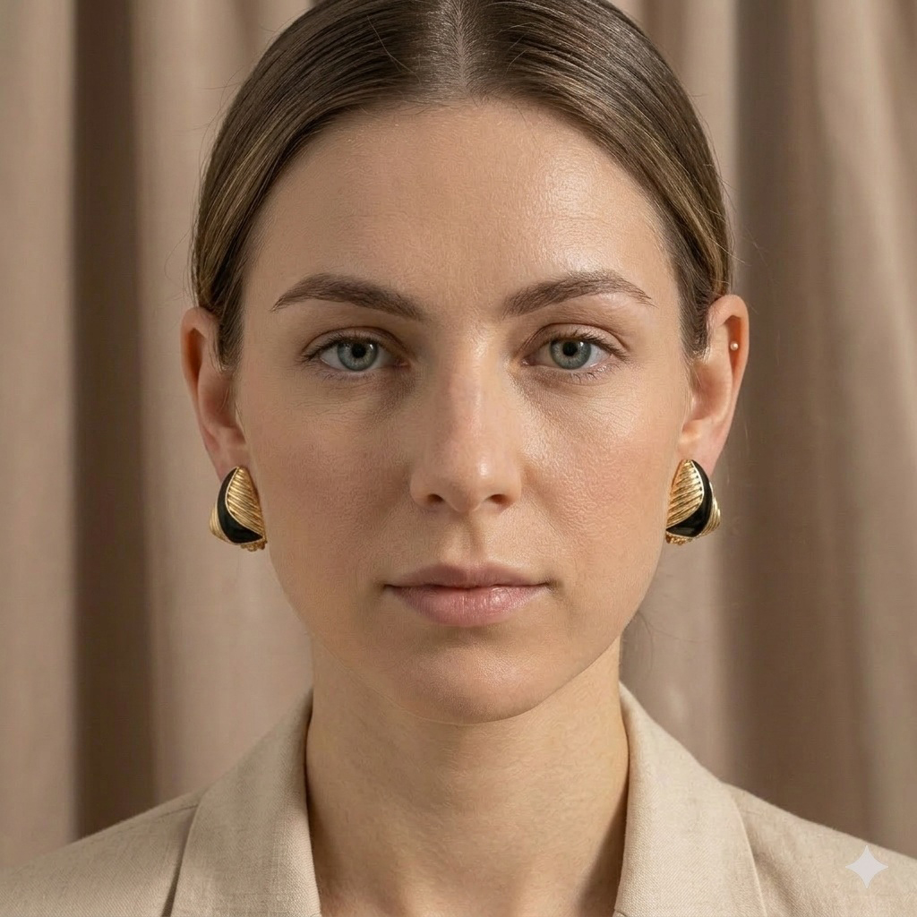 Powierzchnia kolczyków została ozdobiona subtelną paskowaną fakturą, która pięknie odbija światło i nadaje biżuterii eleganckiej głębi. Przez środek kolczyka przebiega nieregularny, szeroki pasek z czarnej emalii, tworząc efektowny kontrast pomiędzy złotą powierzchnią a głęboką czernią. Dzięki temu kolczyki damskie prezentują się niezwykle stylowo i przyciągają uwagę swoim wyjątkowym wzornictwem.