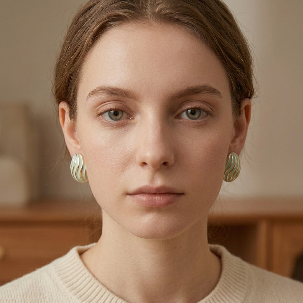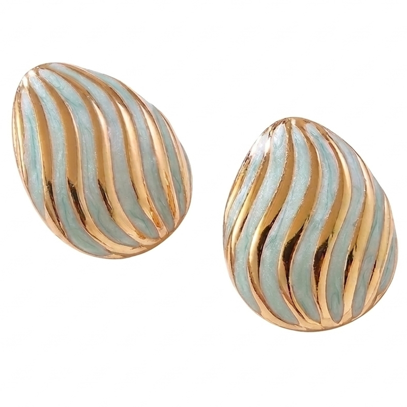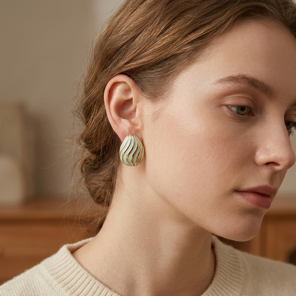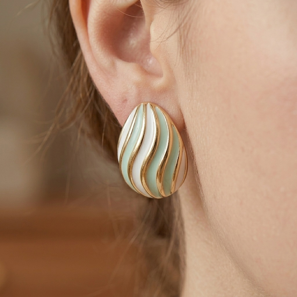 Połączenie ciepłego złota z pastelową zielenią tworzy harmonijną kompozycję kolorystyczną, która przyciąga wzrok, a jednocześnie pozostaje subtelna i elegancka. Dzięki temu kolczyki pozłacane prezentują się bardzo kobieco i stylowo. Falujące linie inspirowane naturalną strukturą muszli nadają biżuterii lekkości oraz unikalnego wyglądu. Te kolczyki damskie są doskonałym wyborem dla kobiet, które lubią dodatki wyróżniające się ciekawym wzorem i delikatną kolorystyką.