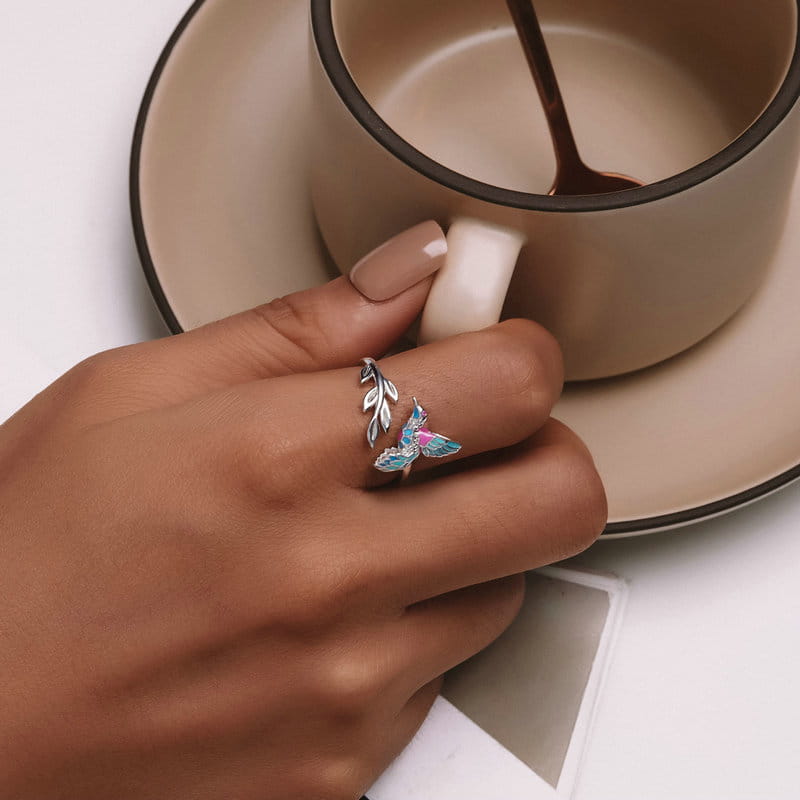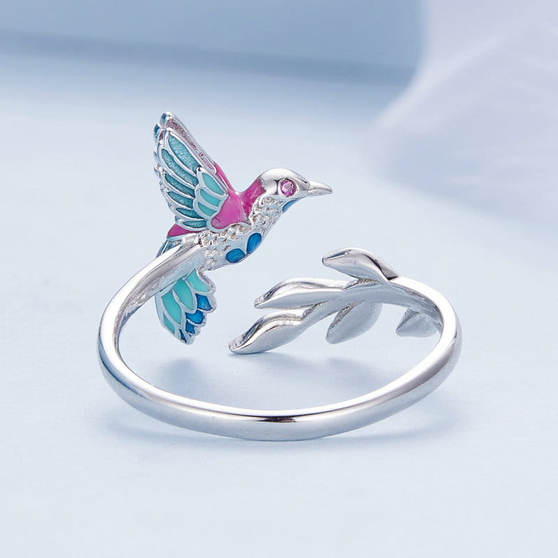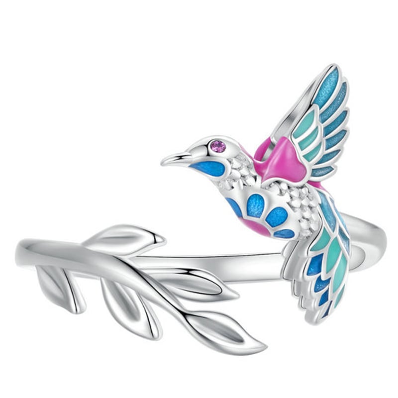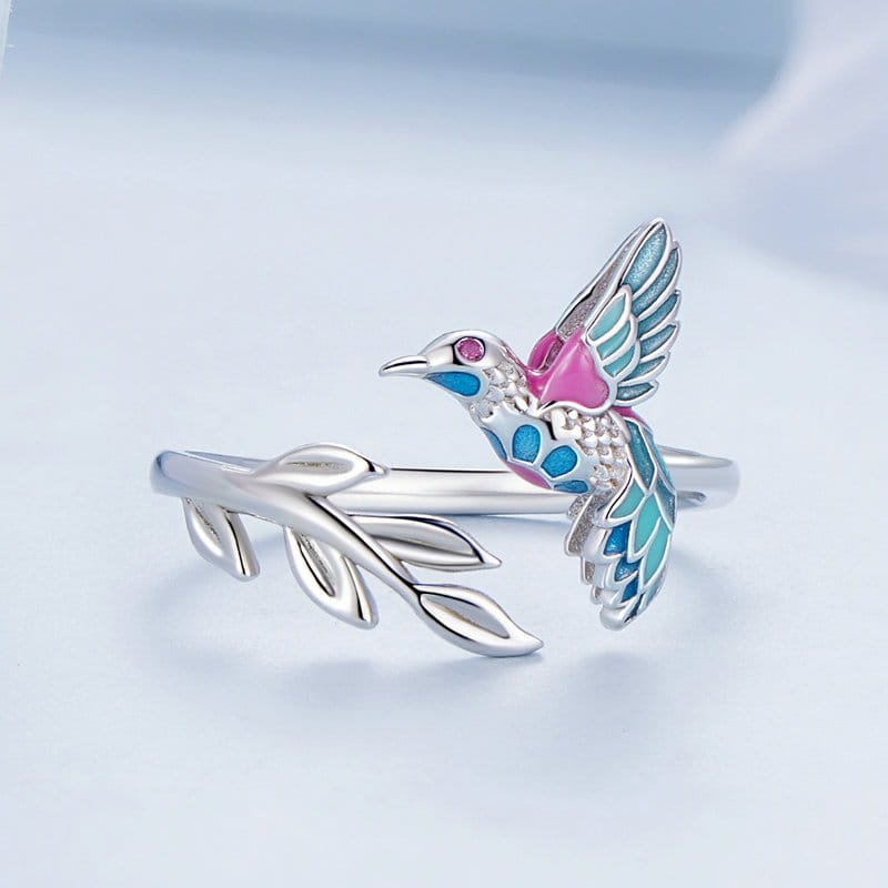 Wyjątkowy pierścionek został wykonany ze srebra najwyższej próby 925. Pierścionek regulowany przedstawiający kolorowego kolibra i gałązkę z listkami.