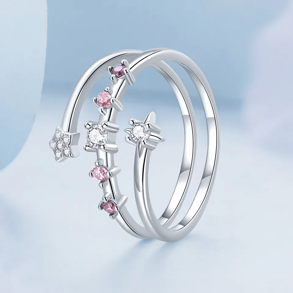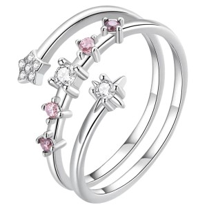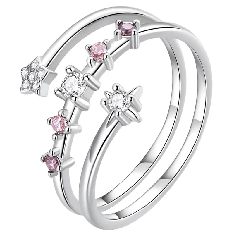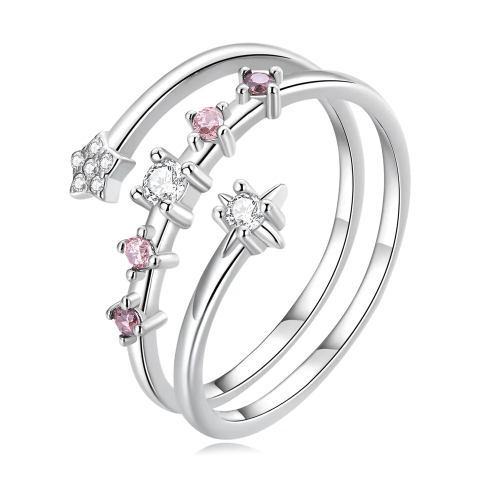 Potrójny pierścionek wykonany ze srebra najwyższej próby 925, ozdobiony jest małymi gwiazdkami wykonanymi z cyrkonii najwyższej jakości w kolorach białym i różowym.