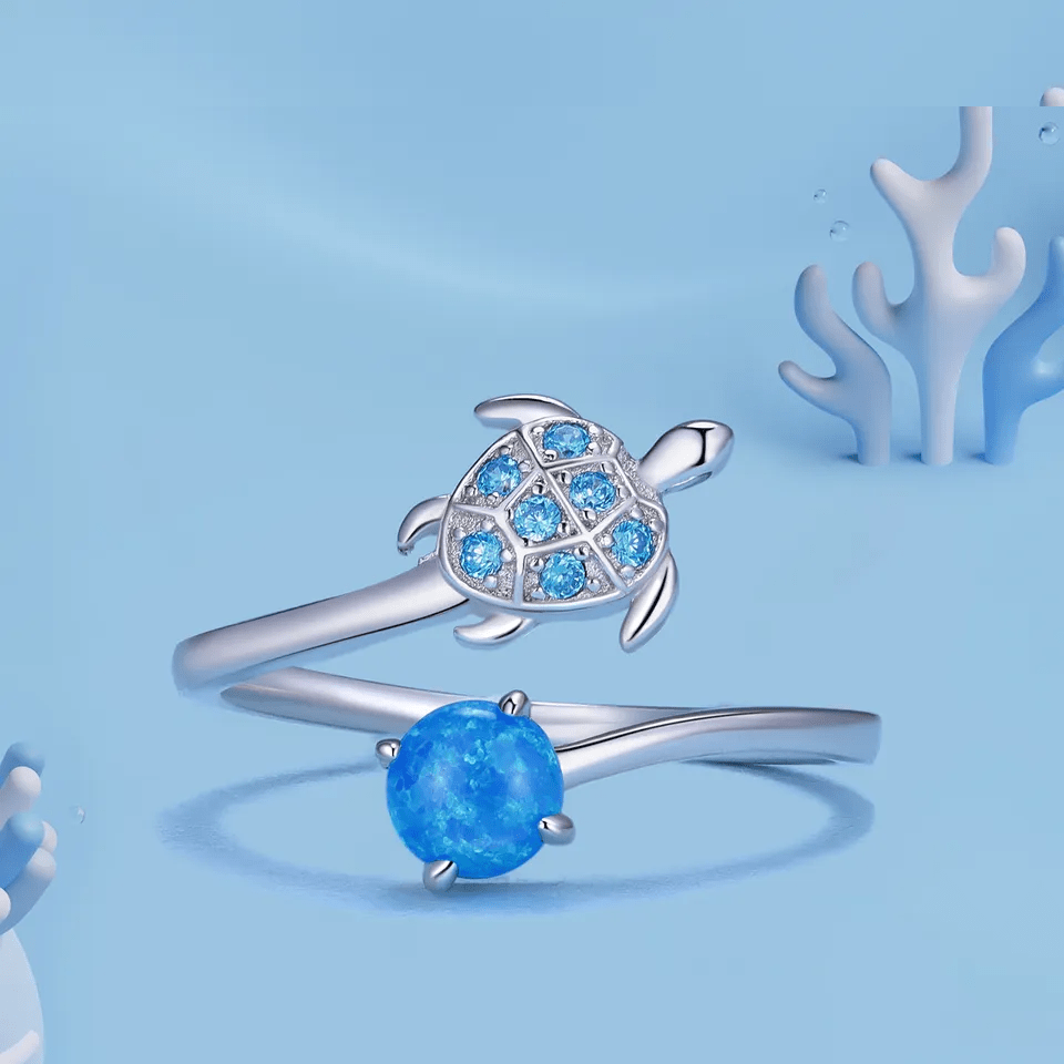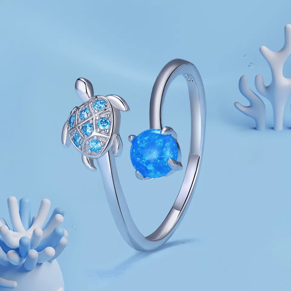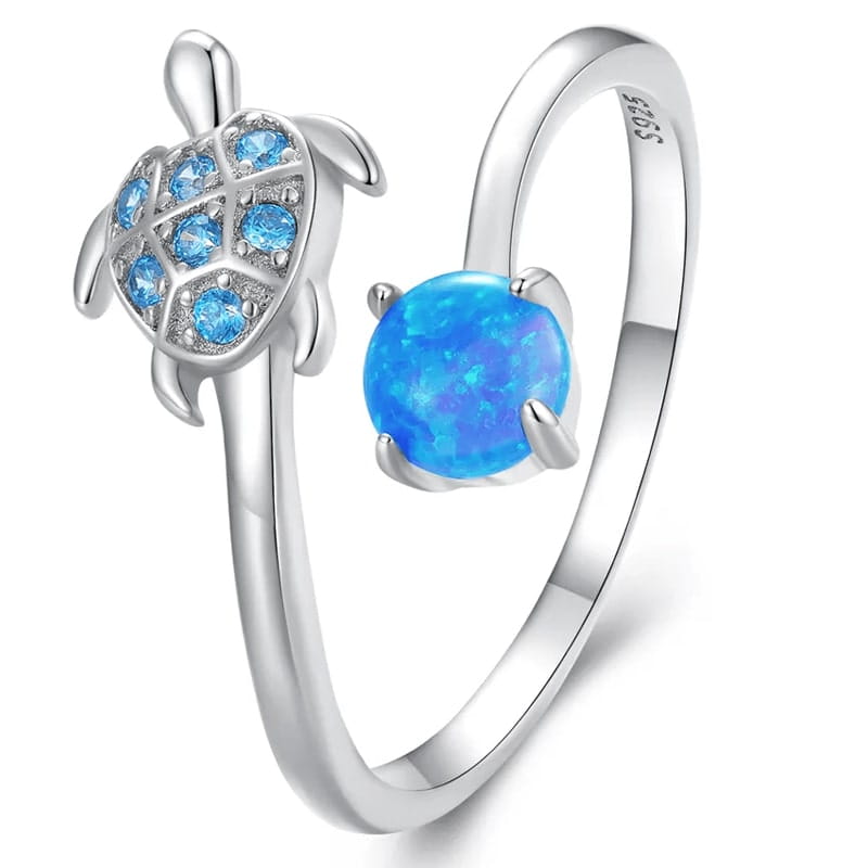 Wyjątkowy pierścionek został wykonany ze srebra najwyższej próby 925. Pierścionek przedstawia morskiego żółwia oraz kuleczkę z krystalicznej cyrkonii najwyższej jakości w kolorze niebieskim, które pięknie się uzupełniają.